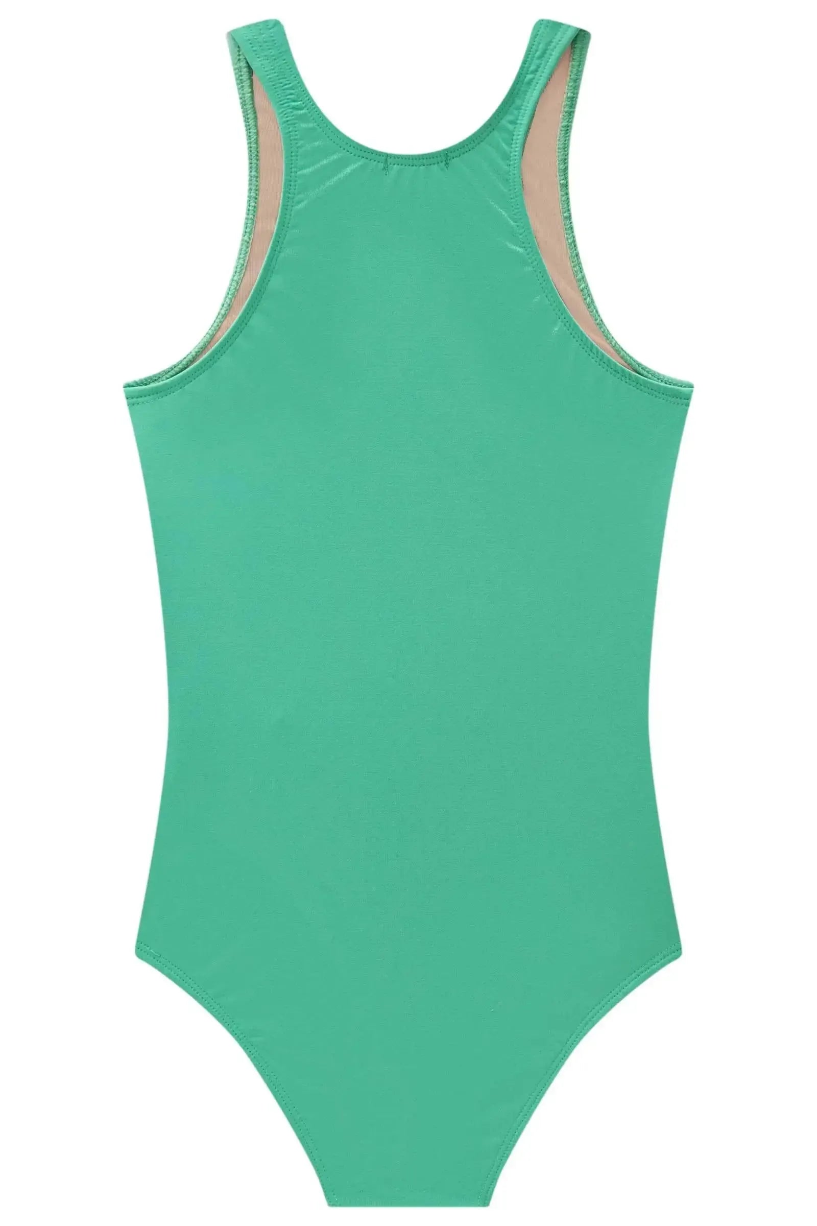 O maiô em malha UV50+ é perfeito para as meninas que amam um look cheio de estilo e conforto para aproveitar muito o verão! Disponível em uma cor super estilosa - verde - ele oferece um toque super macio e confortável, garantindo proteção para a pele das meninas! A sublimação divertida e o strass, adicionam um charme especial à peça.