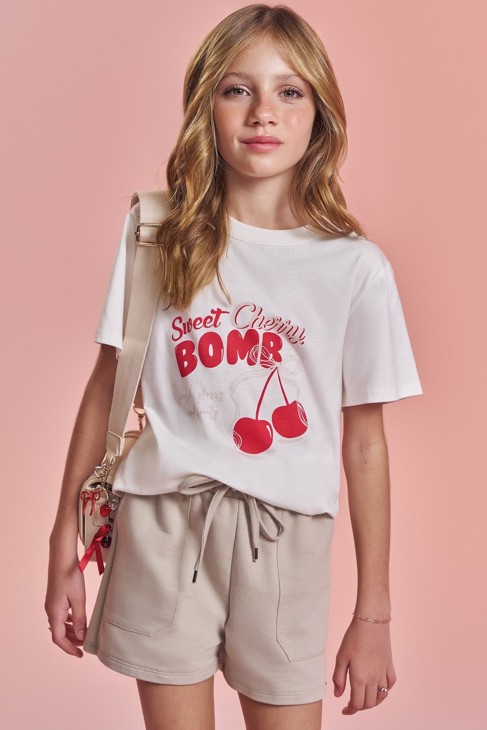 A blusa off-white possui estampa divertida de cerejas com lettering que adiciona um toque moderno e descontraído ao visual.