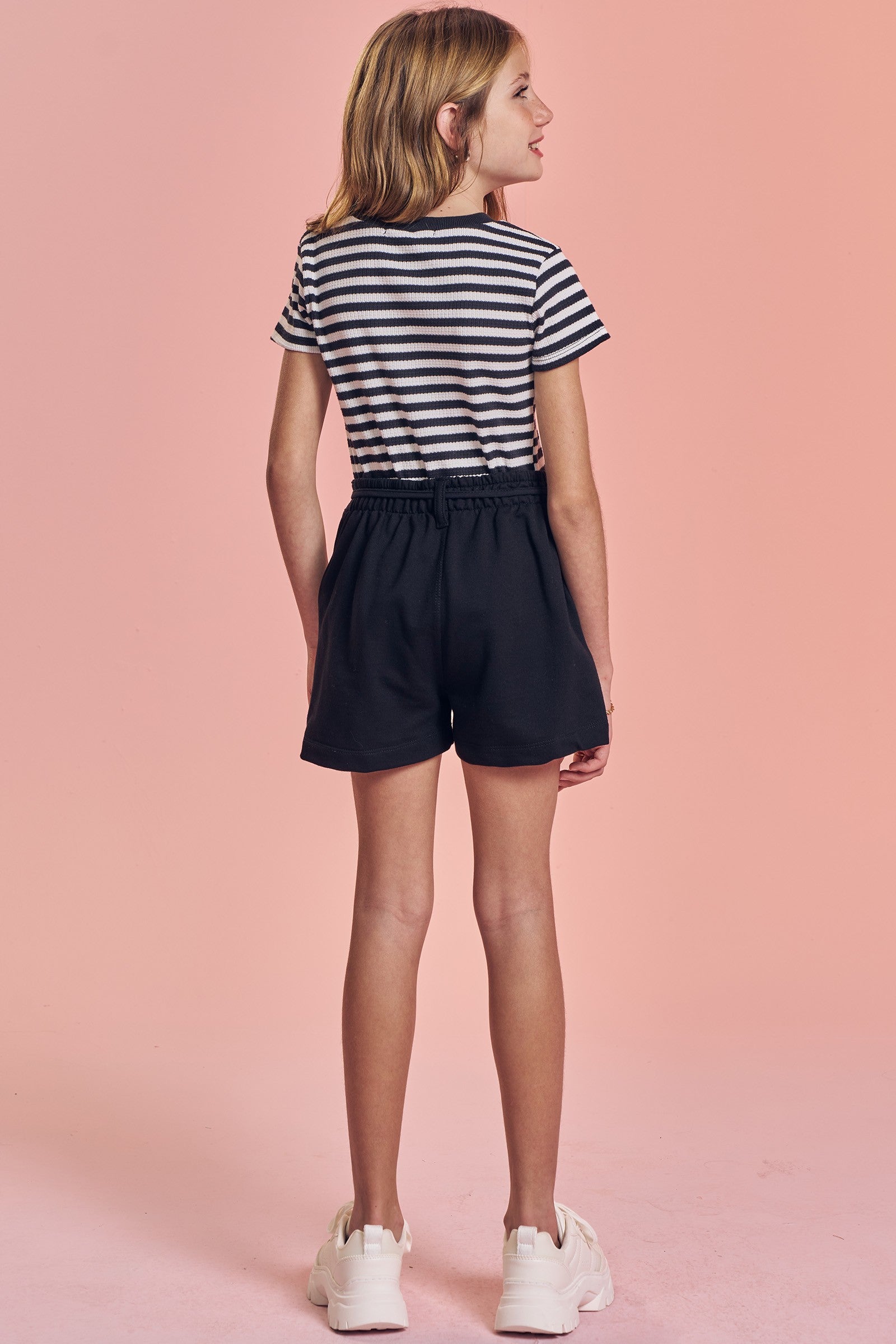 Composto por blusa em malha waffle listrada e shorts em moletom sem pelúcia, o look traz o equilíbrio perfeito entre o toque fashion e a praticidade do dia a dia.