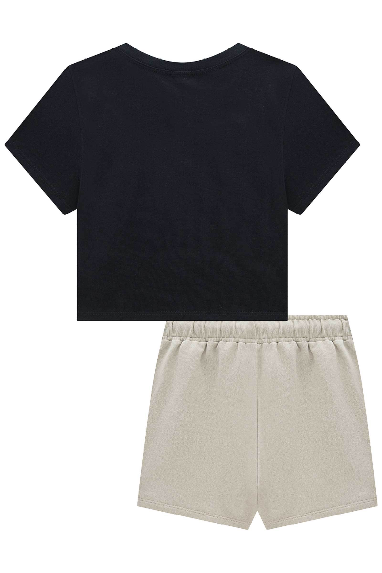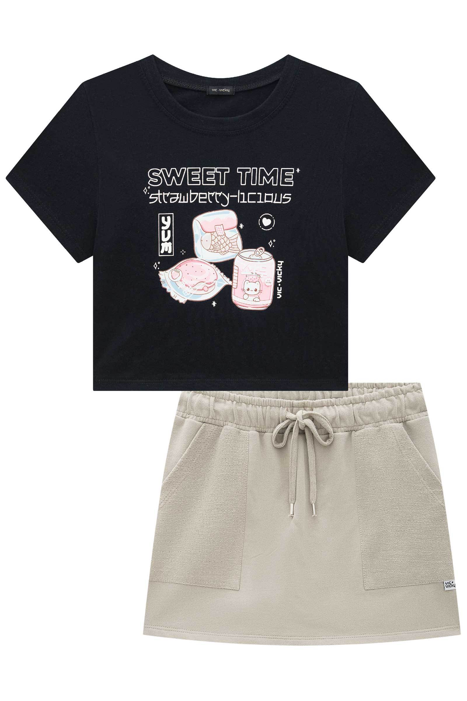 Composto por blusa boxy em meia malha preta e short saia em moletom sem pelúcia, o modelo traz um visual moderno, fofo e cheio de personalidade.