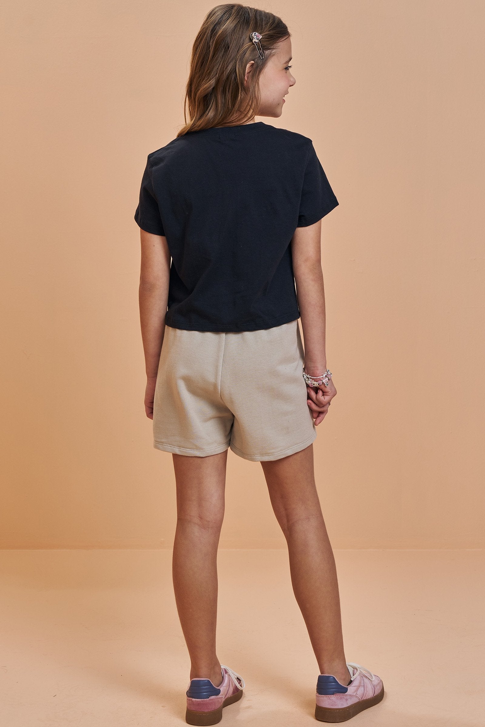 Já o short saia em tom neutro possui bolsos frontais funcionais e cordão decorativo com ponteiras metálicas, garantindo praticidade e conforto durante todo o dia.