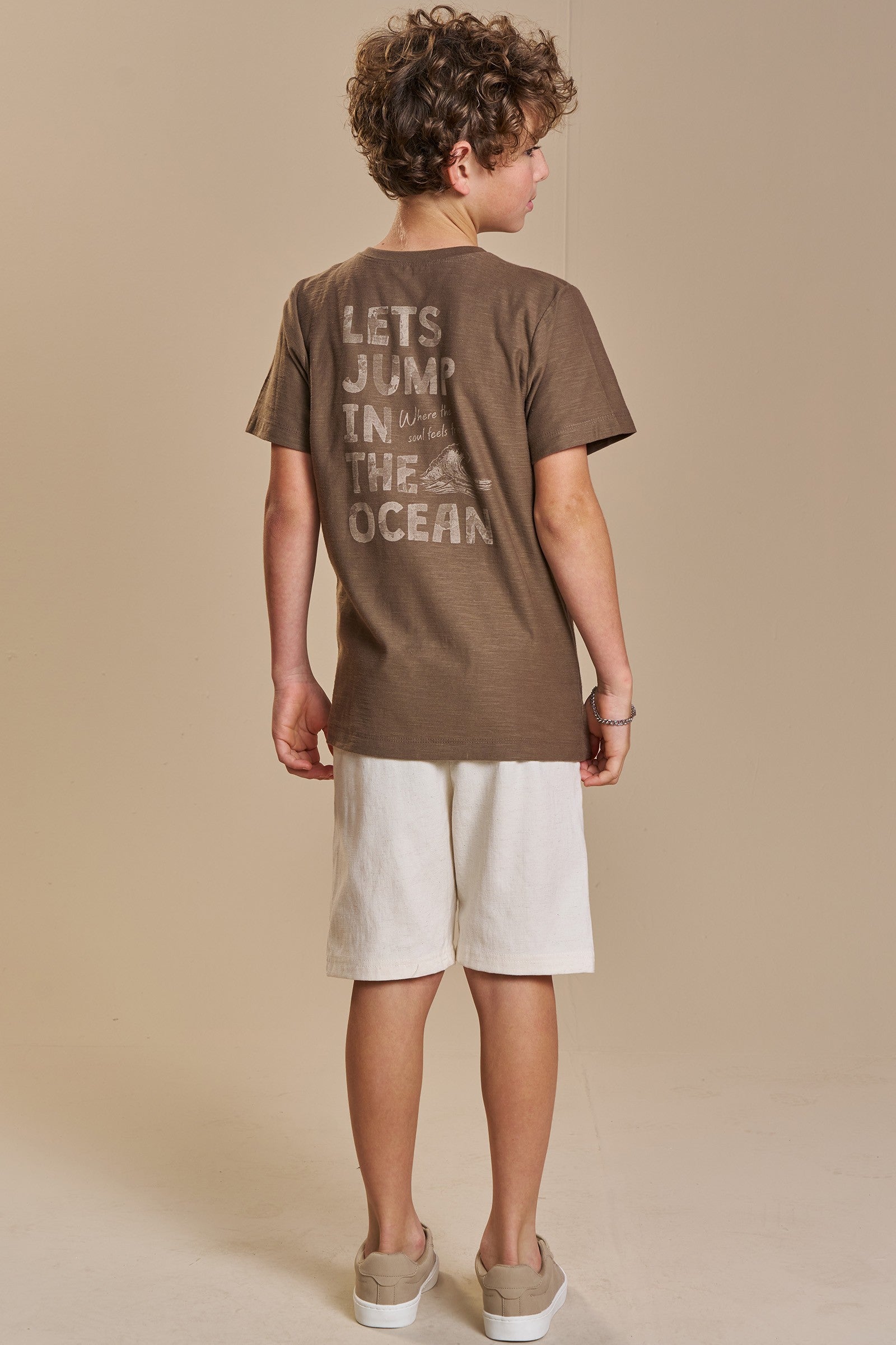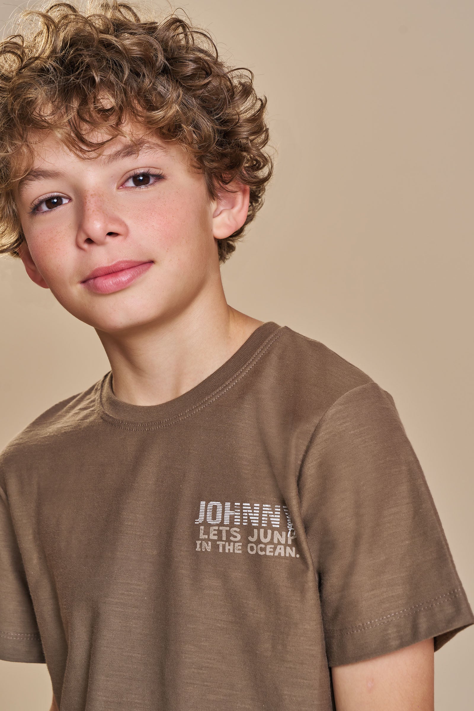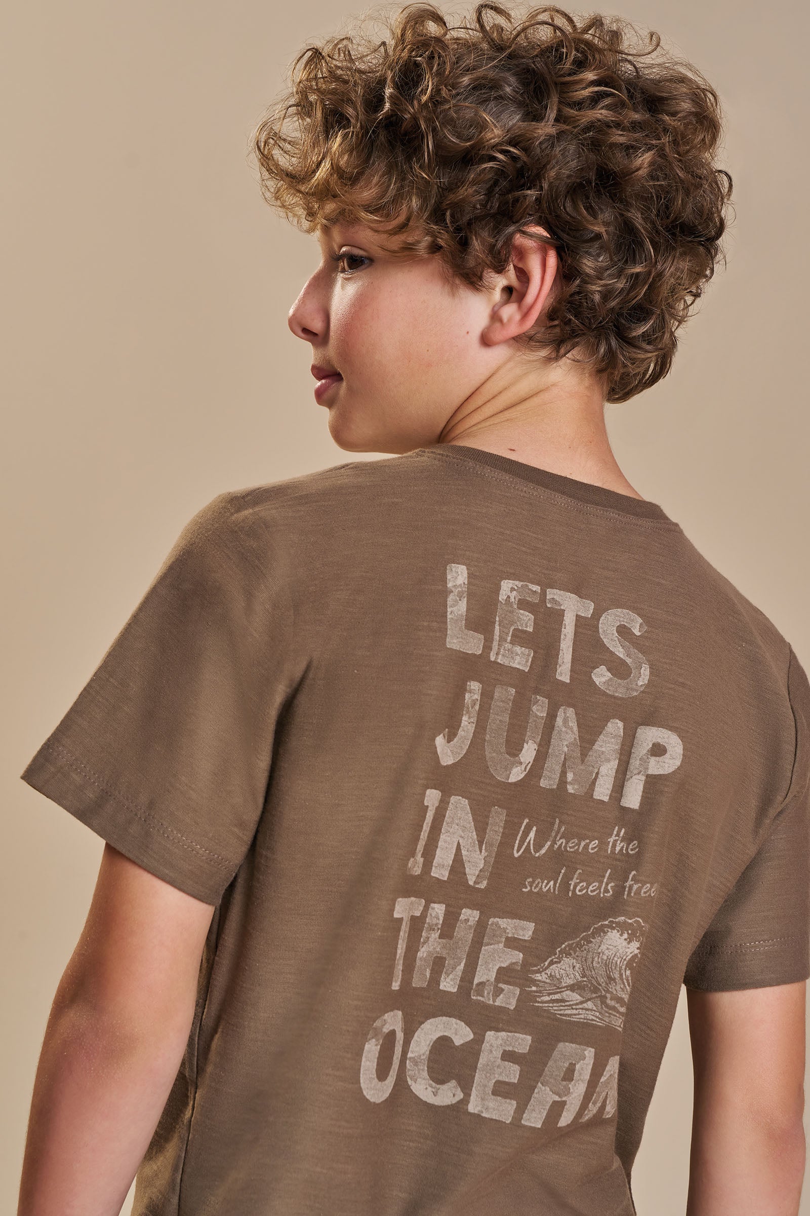 A camiseta em meia malha flamê traz textura diferenciada e visual despojado, com estampa frontal discreta e frase inspiradora nas costas ''Let's Jump Into the Ocean'', reforçando o espírito aventureiro da marca.