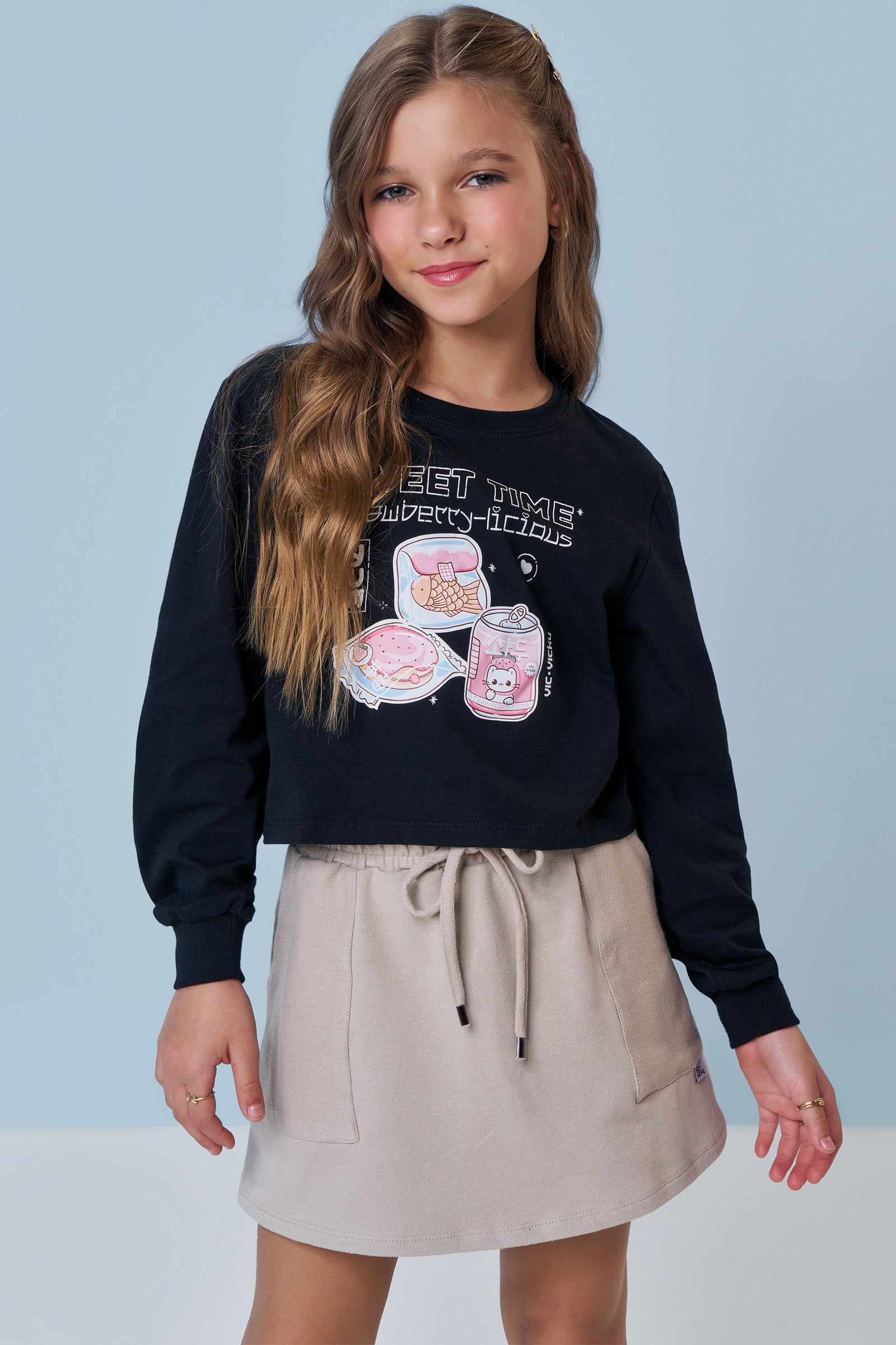 O conjunto de blusa boxy em meia malha e short saia em moletom sem pelúcia, é a escolha perfeita para as meninas que amam um look cheio de conforto, sem abrir mão do estilo no dia à dia! Disponível em uma cor super estilosa - preto - ela é uma peça essencial, perfeita para montar diversos looks e deixar o inverno das pequenas ainda mais estiloso! A estampa divertida, adiciona um charme especial à peça.