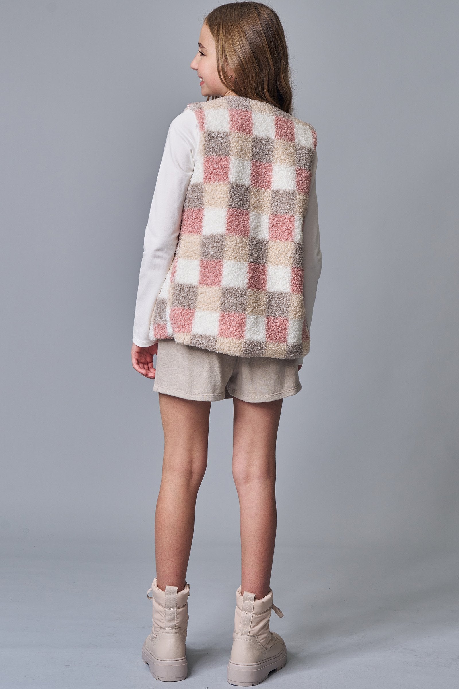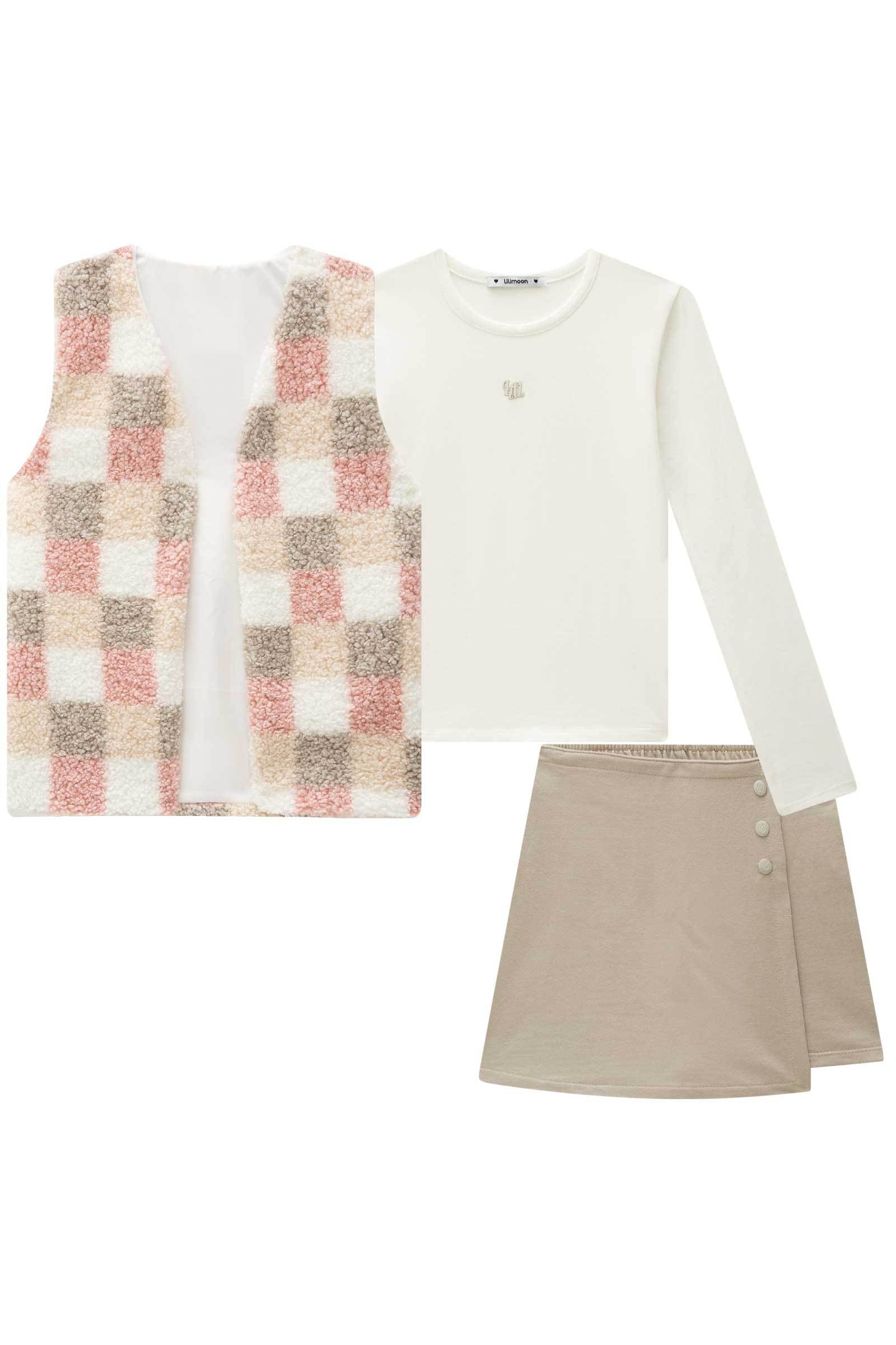 Trio de Blusa em Cotton Colete em Pelo Sintético e Short Saia em Moletom sem Pelúcia 91751 Lilimoon Teen Menina