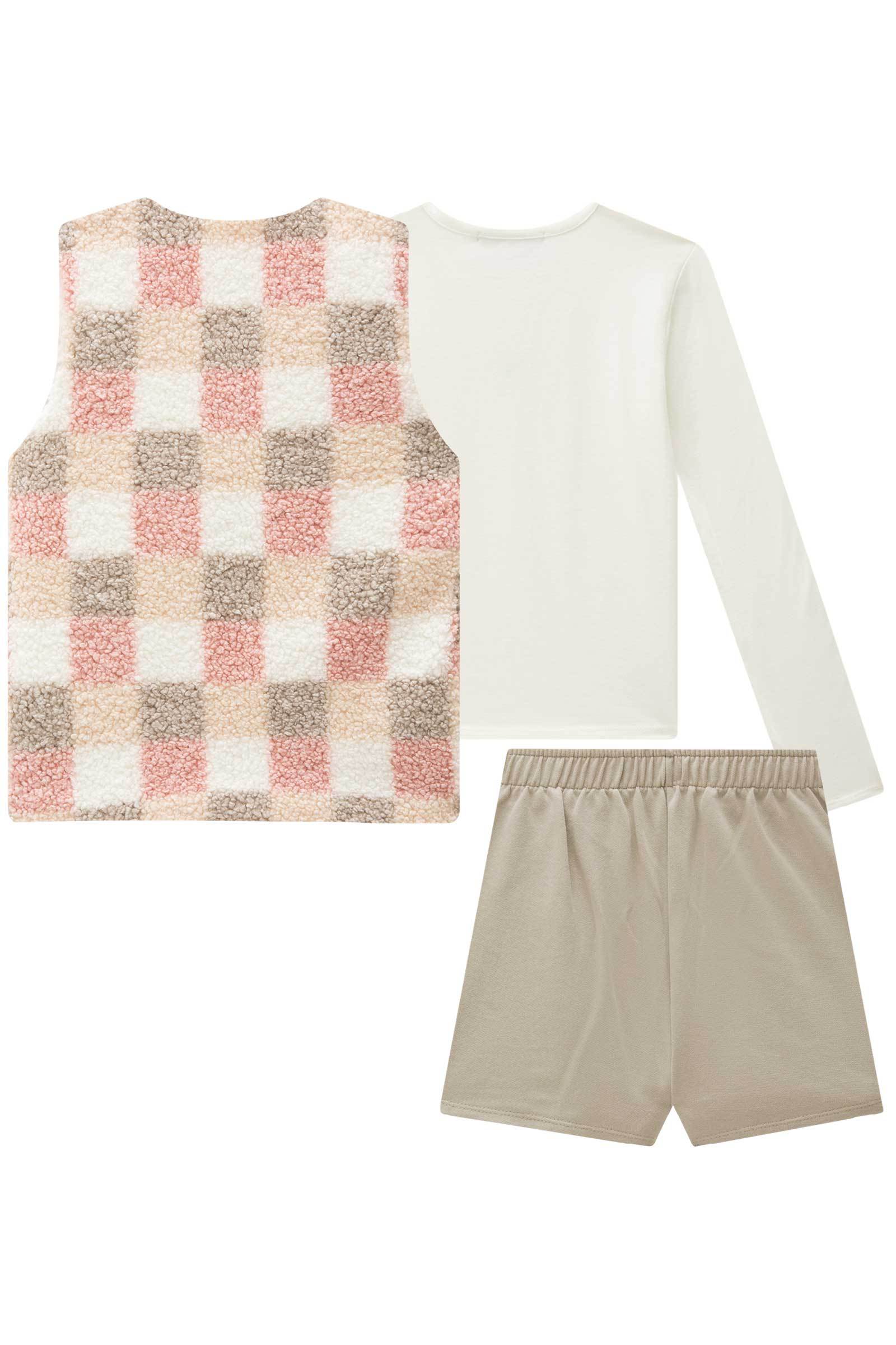 O trio de blusa em cotton, colete em pelo sintético e short saia em moletom sem pelúcia, é a escolha perfeita para as meninas que amam um look cheio de conforto, sem abrir mão do estilo no dia à dia! Disponível em uma cor super estilosa - bege - ela é uma peça essencial, perfeita para montar diversos looks e deixar o inverno das pequenas ainda mais estiloso!