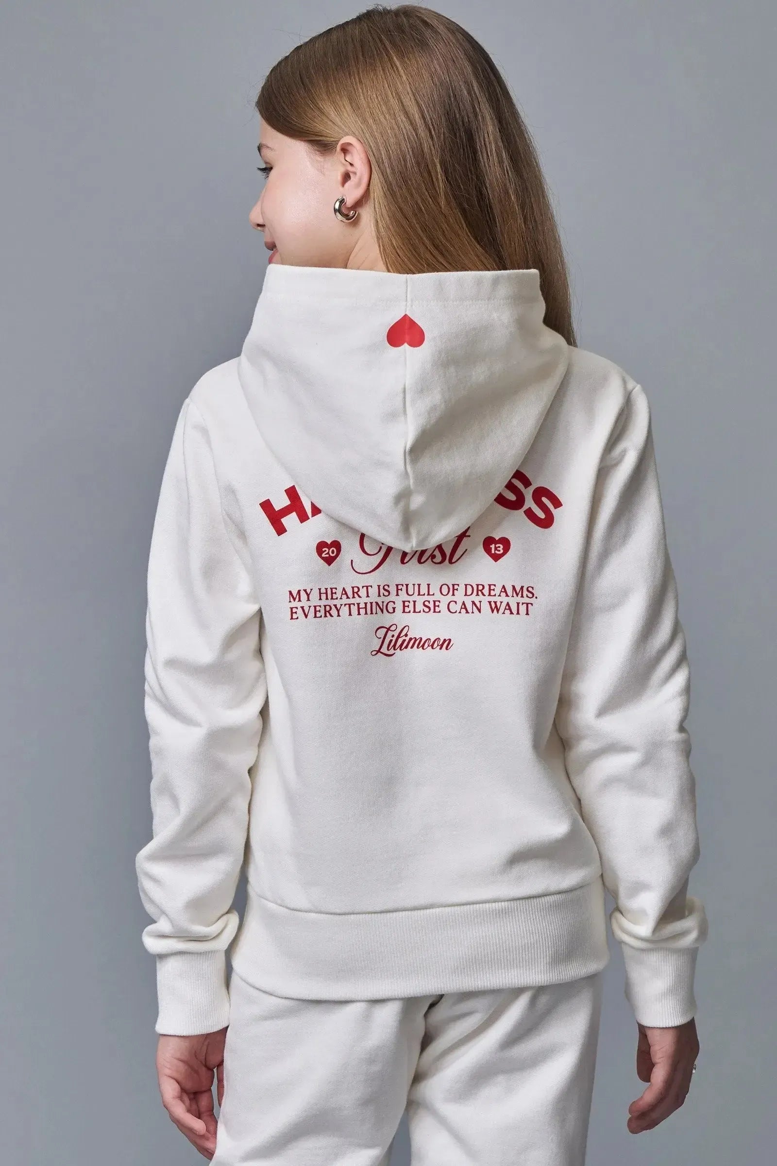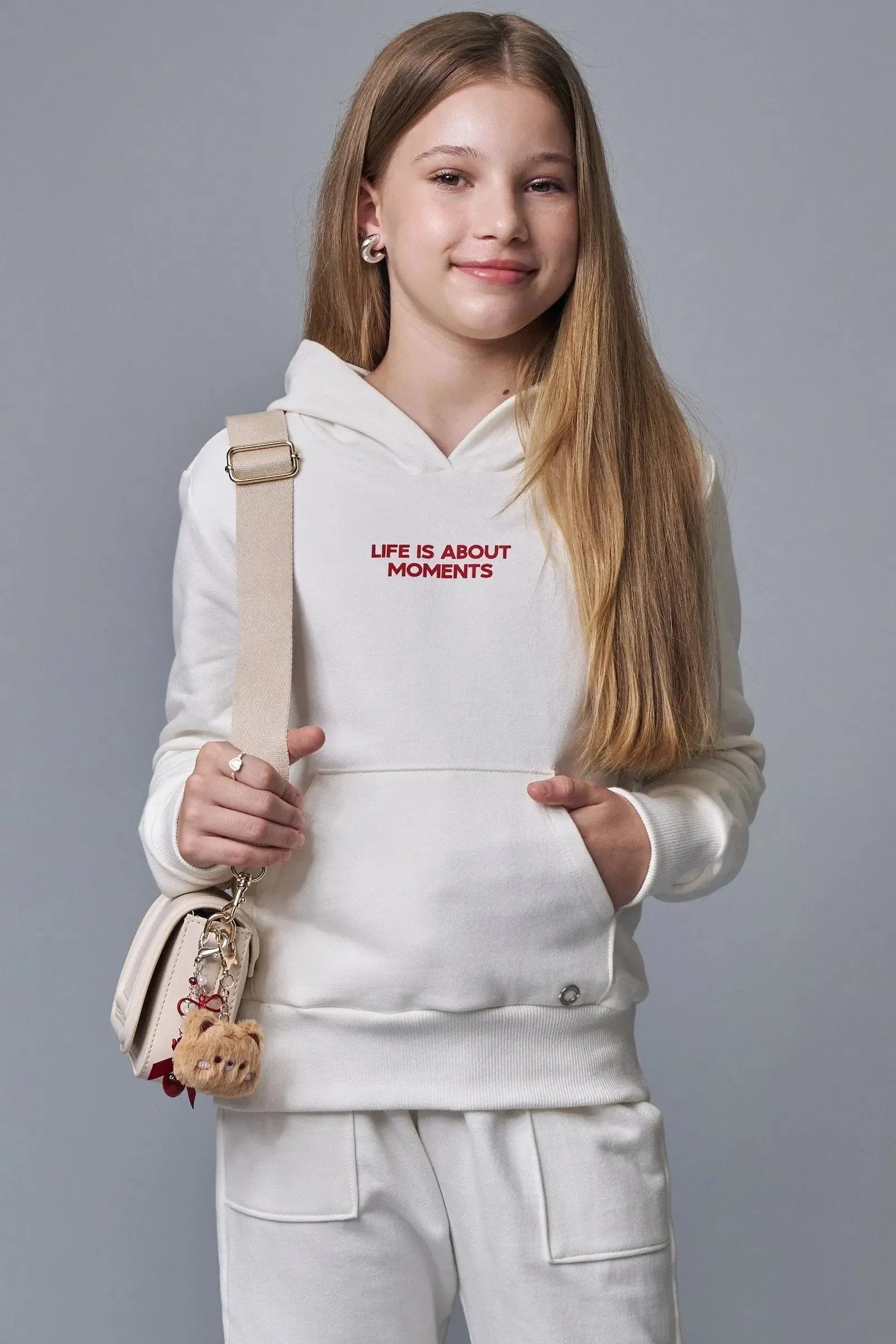 O blusão com capuz em moletom com pelúcia, é a escolha perfeita para as meninas que amam um look cheio de conforto, sem abrir mão do estilo no dia à dia! Disponível em uma cor super estilosa - off white - ela é uma peça essencial, perfeita para montar diversos looks e deixar o inverno das pequenas ainda mais estiloso! A estampa divertida, adiciona um charme especial à peça.