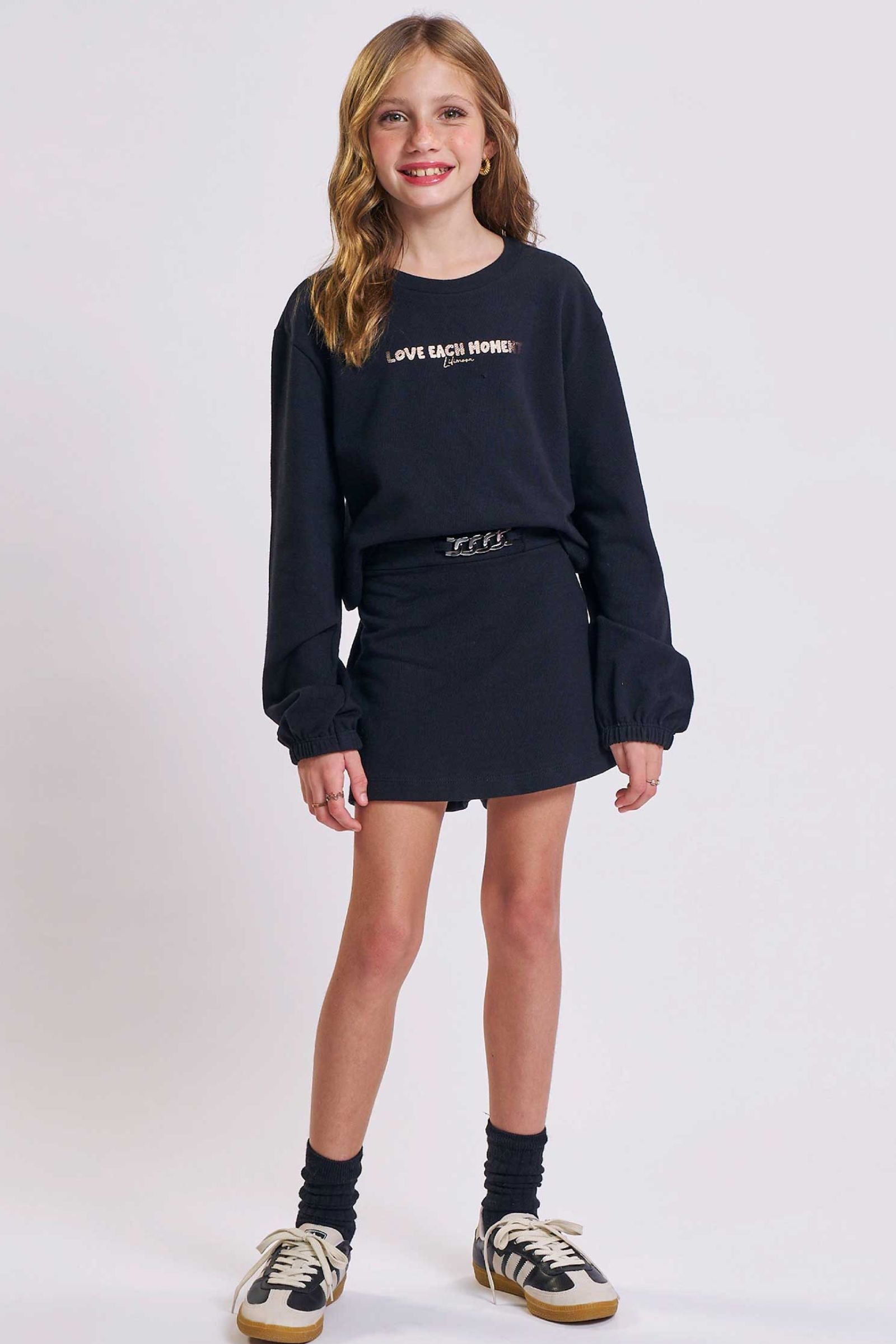 O conjunto de blusão cropped e short saia em moletwill, é a escolha perfeita para as meninas que amam um look cheio de conforto, sem abrir mão do estilo no dia à dia! Disponível em uma cor super estilosa - preto - ela é uma peça essencial, perfeita para montar diversos looks e deixar o inverno das pequenas ainda mais estiloso! A estampa divertida, adiciona um charme especial à peça.