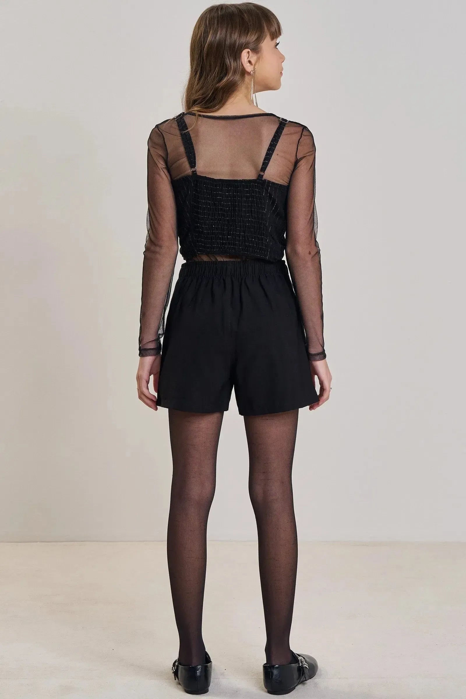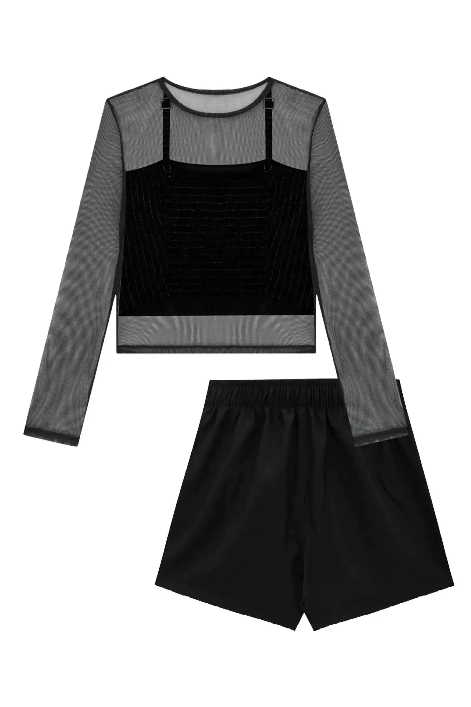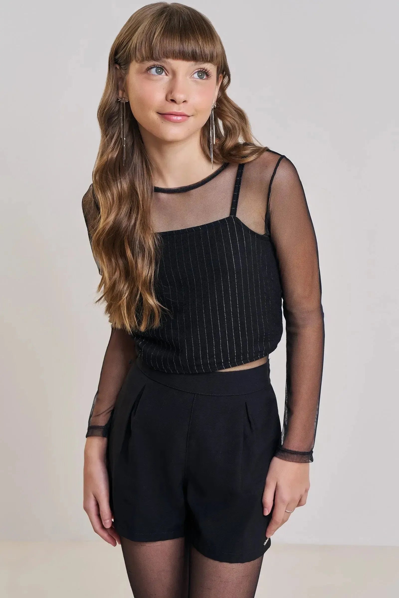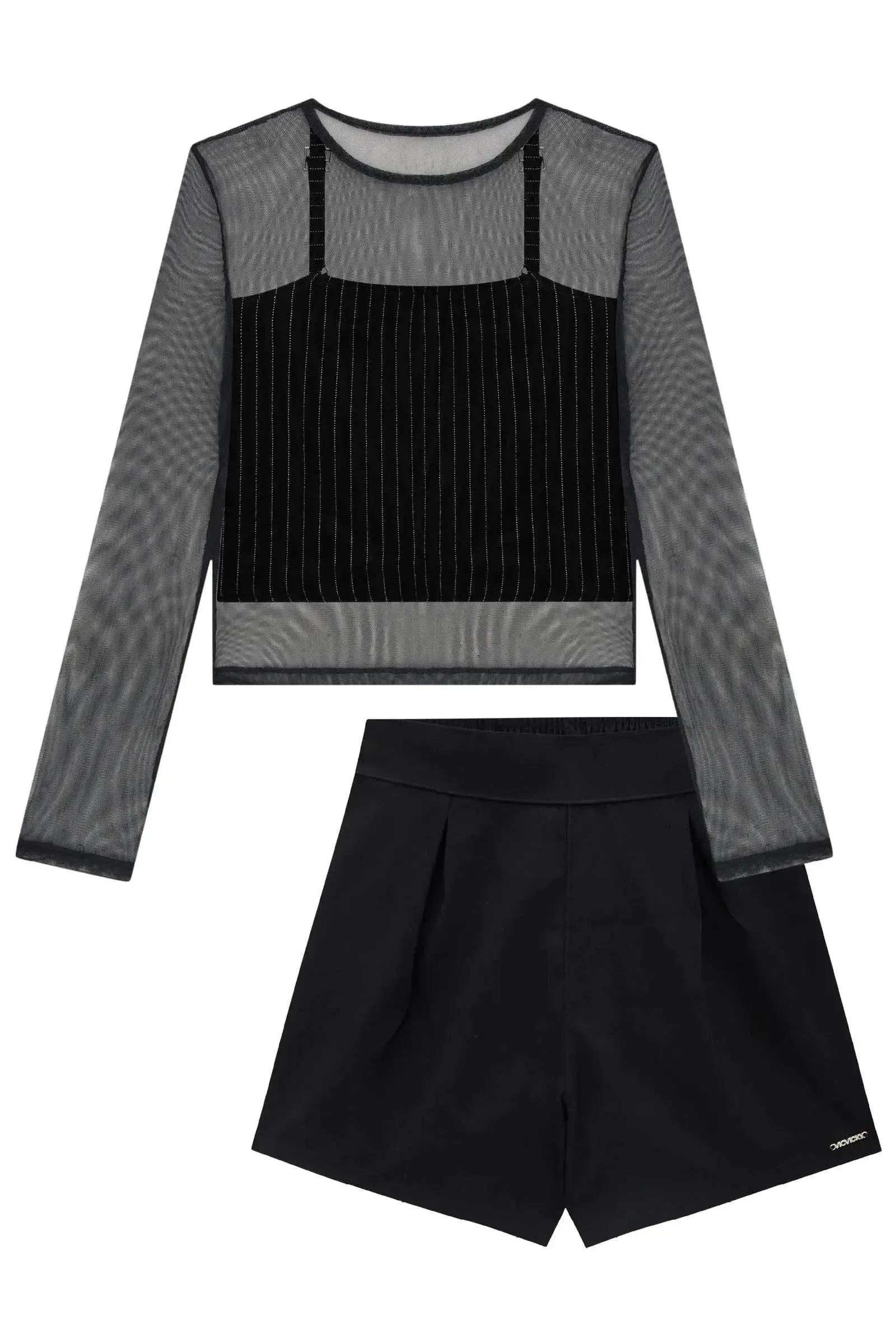 Trio de Blusa em Tule Sobreposição Regata Cropped em Visco Shine e Shorts em Alfaiataria 90128 Vic&Vicky Teen Menina