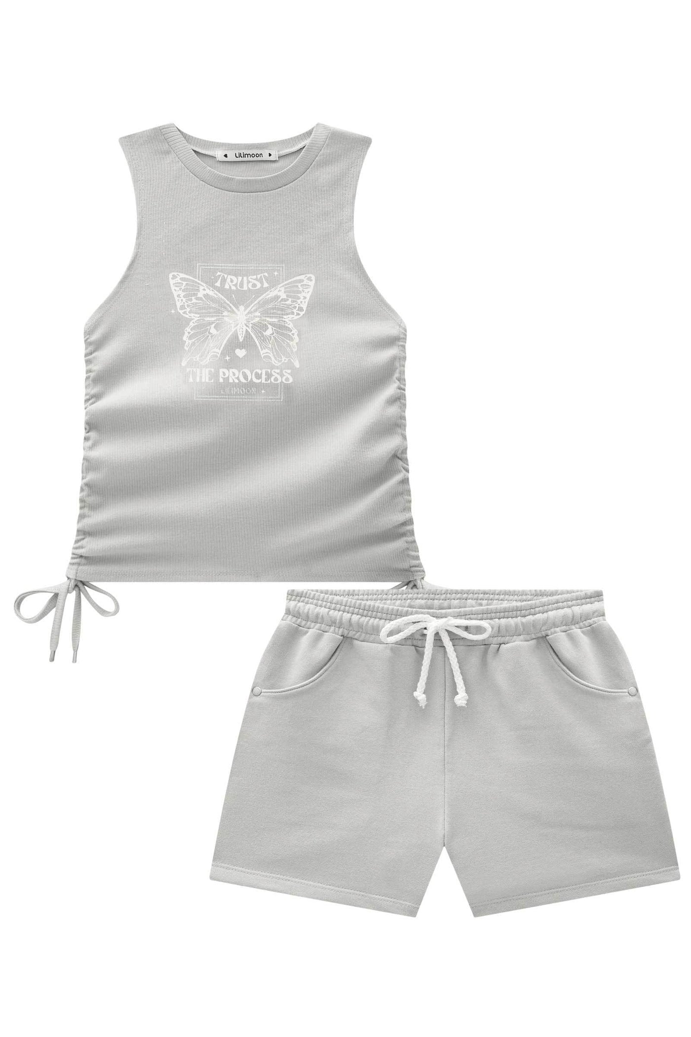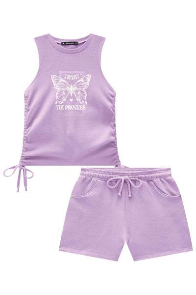 O conjunto de regata cropped em canelado e shorts em moletom sem pelúcia é perfeito para quem busca conforto, leveza e muito estilo. Disponível em duas cores super estilosas - cinza e lilás - este conjunto é a escolha ideal para os dias mais quentes. A estampa de borboleta com foil prata, adiciona um charme especial à peça.