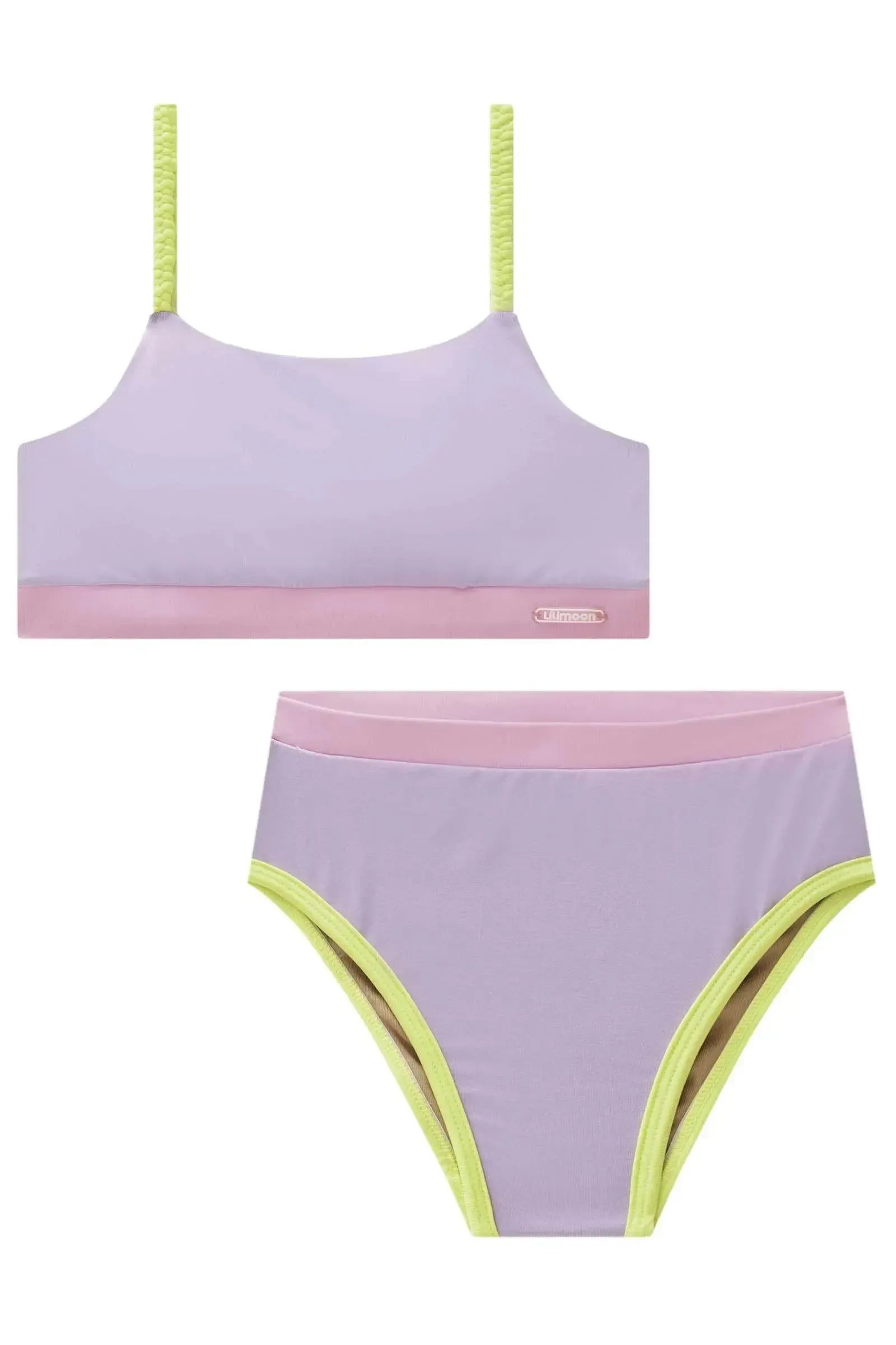O conjunto de biquíni com top e calcinha em malha UV dry 50+ é perfeito para as meninas que amam um look cheio de estilo e conforto para aproveitar muito o verão! Disponível em duas cores super estilosas - lilás e preto - ele oferece um toque super macio e confortável, garantindo proteção para a pele das meninas.