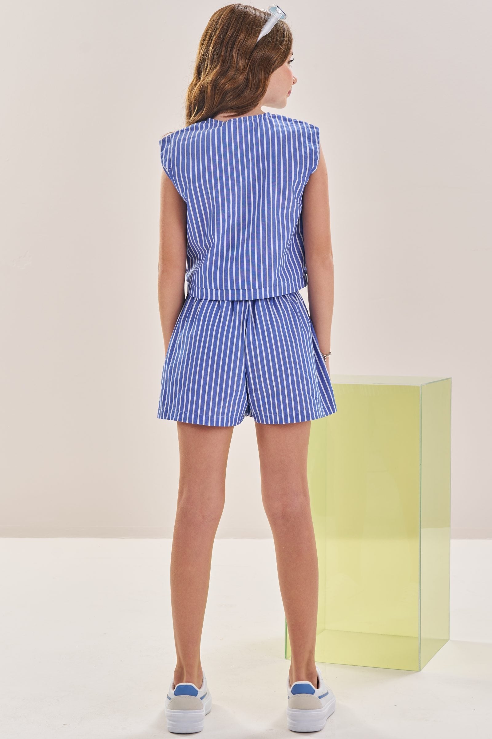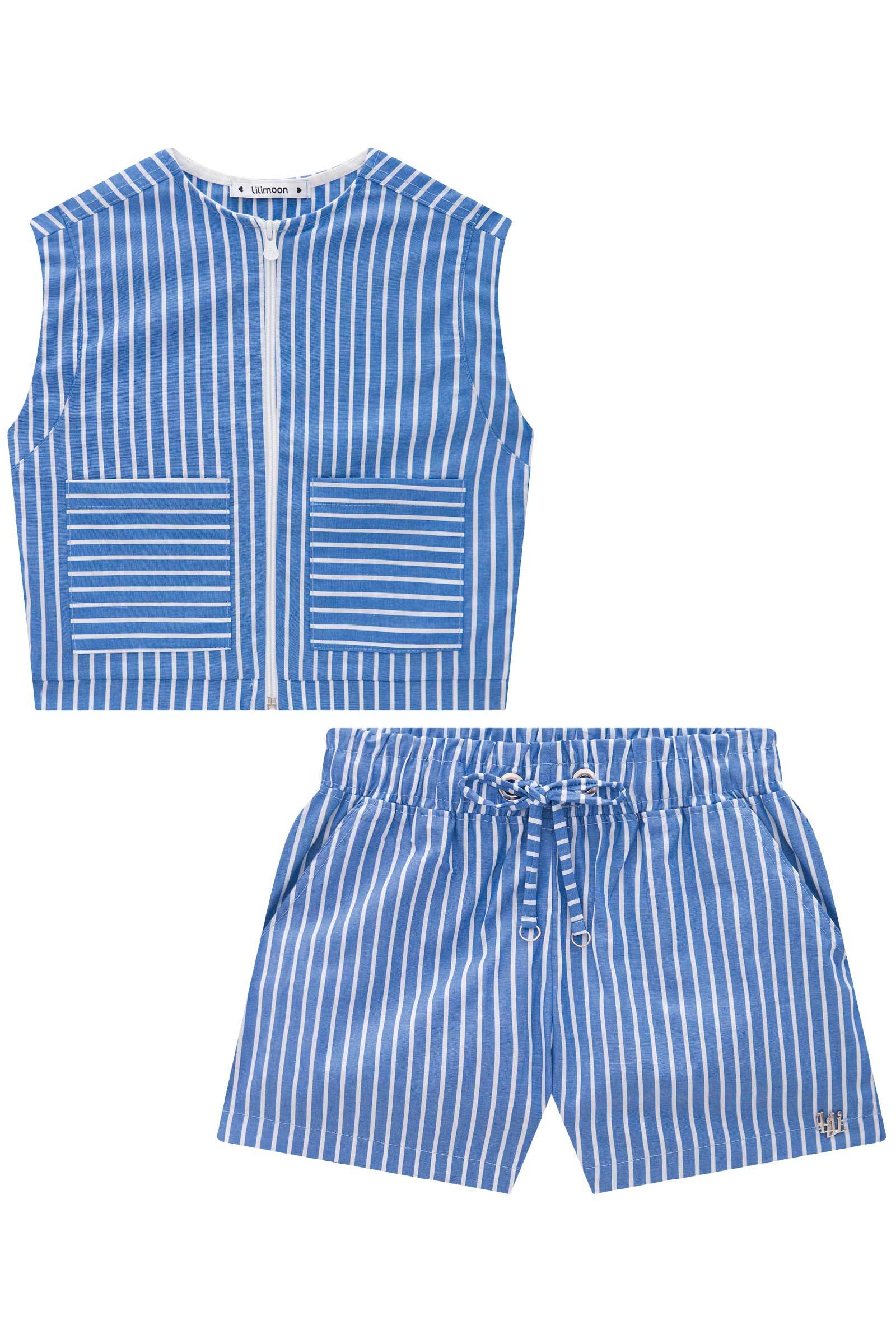 O conjunto de colete boxy e shorts em tricoline listrado é perfeito para quem busca conforto, leveza e muito estilo. Disponível em uma cor super estilosa - azul - este conjunto é a escolha ideal para os dias de verão. A abertura com zíper adiciona um charme especial à peça.