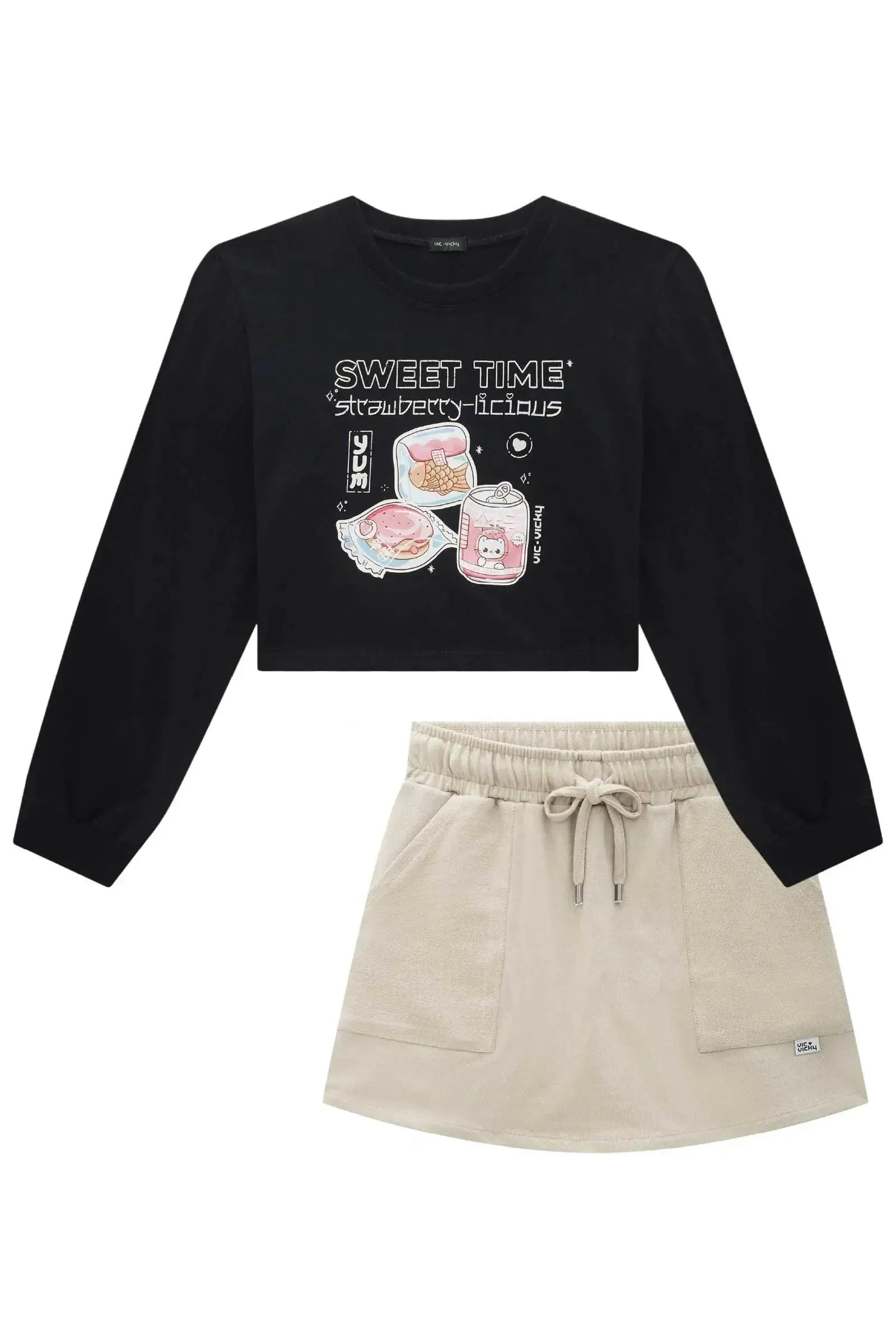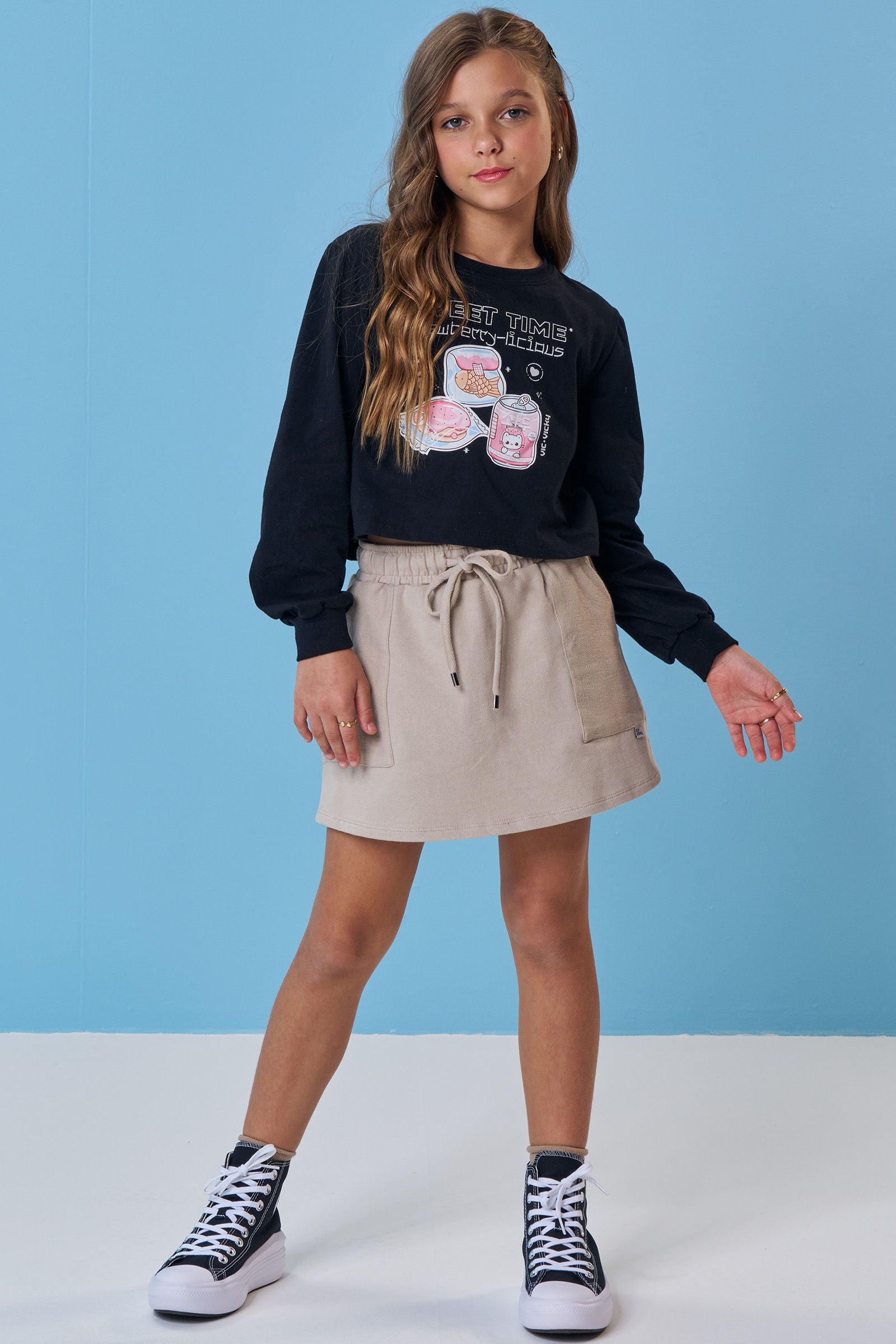 O conjunto de blusa boxy em meia malha e short saia em moletom sem pelúcia, é a escolha perfeita para as meninas que amam um look cheio de conforto, sem abrir mão do estilo no dia à dia! Disponível em uma cor super estilosa - preto - ela é uma peça essencial, perfeita para montar diversos looks e deixar o inverno das pequenas ainda mais estiloso! A estampa divertida, adiciona um charme especial à peça.