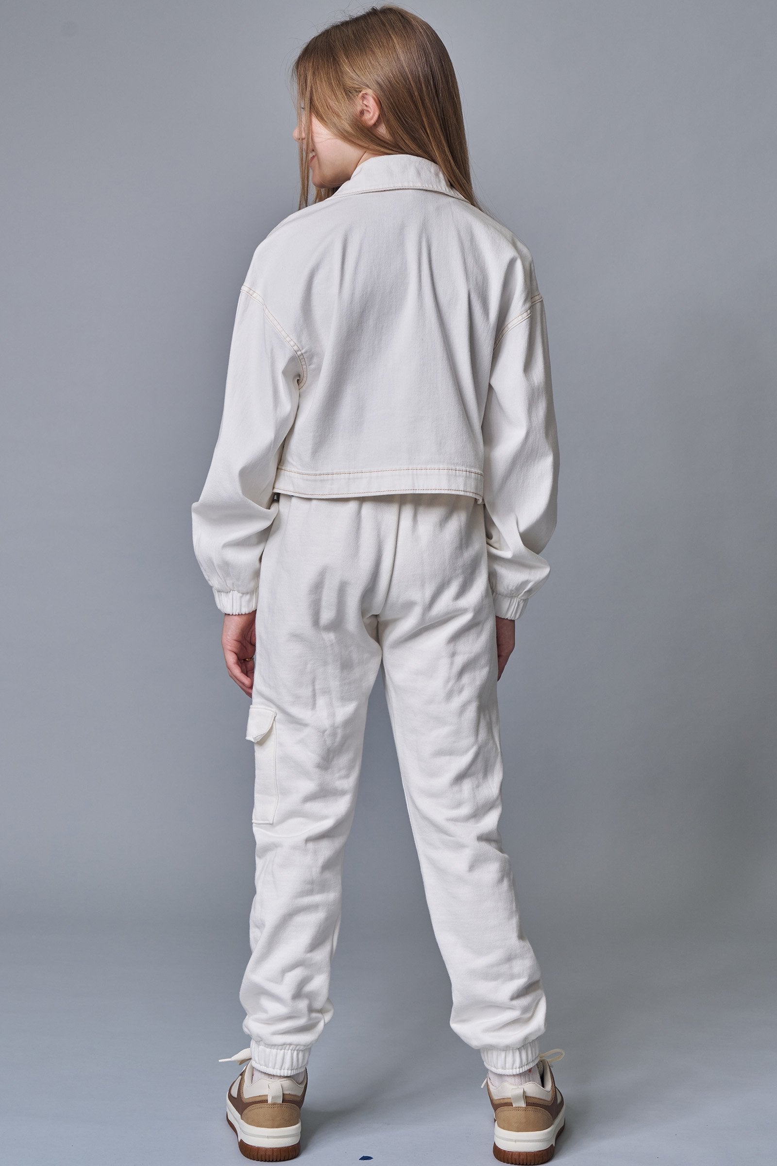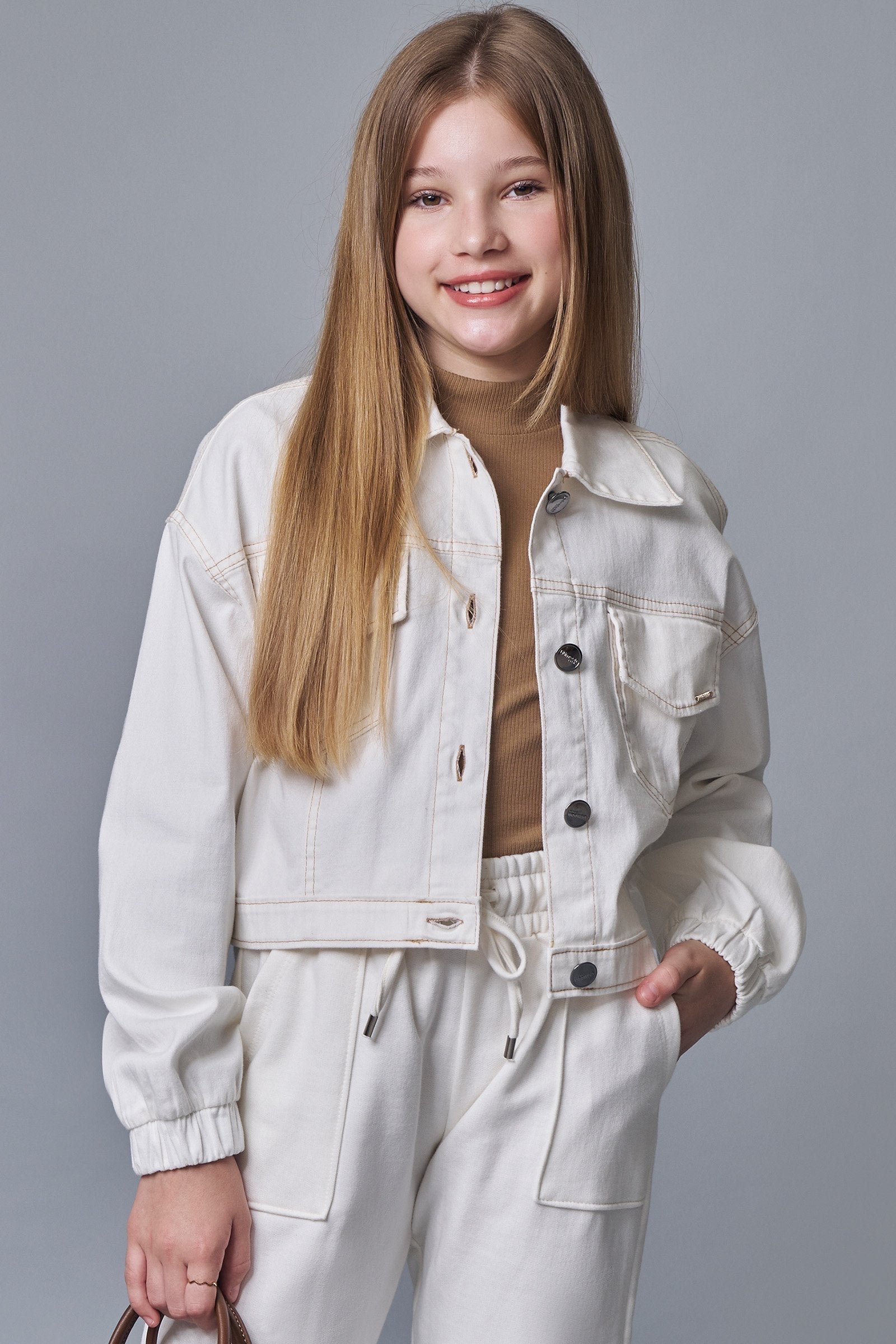 A jaqueta boxy baggy em sarja com elastano, é a escolha perfeita para as meninas que amam um look cheio de conforto, sem abrir mão do estilo no dia à dia! Disponível em uma cor super estilosa - bege - ela é uma peça essencial, perfeita para montar diversos looks e deixar o inverno das pequenas ainda mais estiloso!
