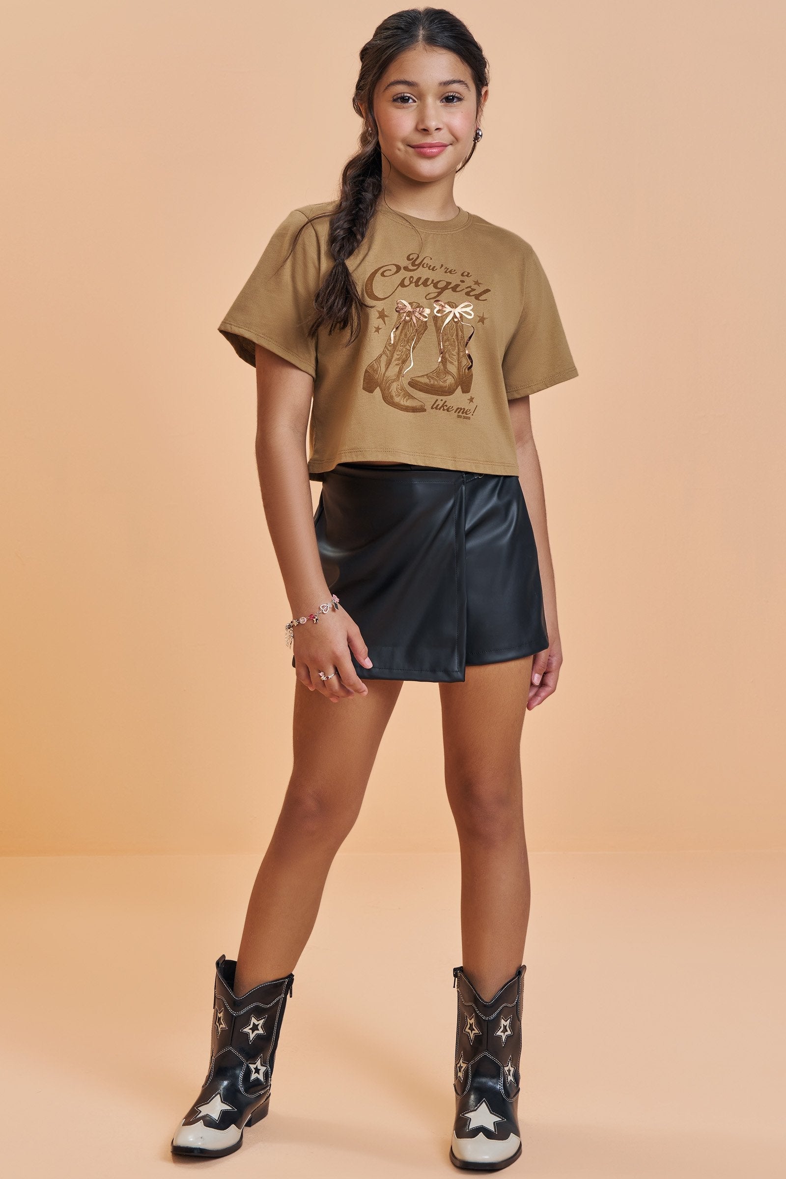O destaque da peça é a estampa em foil com ilustração de botas western e detalhes brilhantes que deixam o look ainda mais divertido.